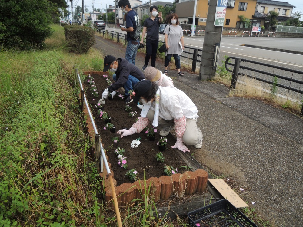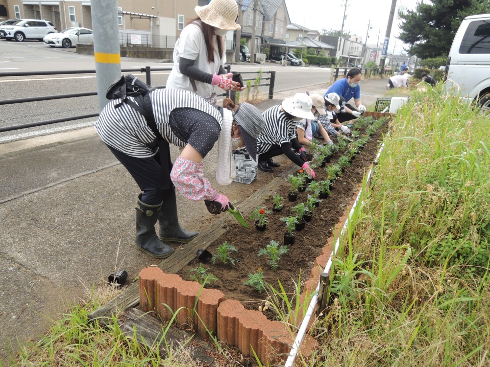 6月28日(日)緑化推進員、公民館役職員ほかボランティアの方々40名近くで粟崎5丁目のフラワーロード、中央公園ロータリー前に花苗を植えました。