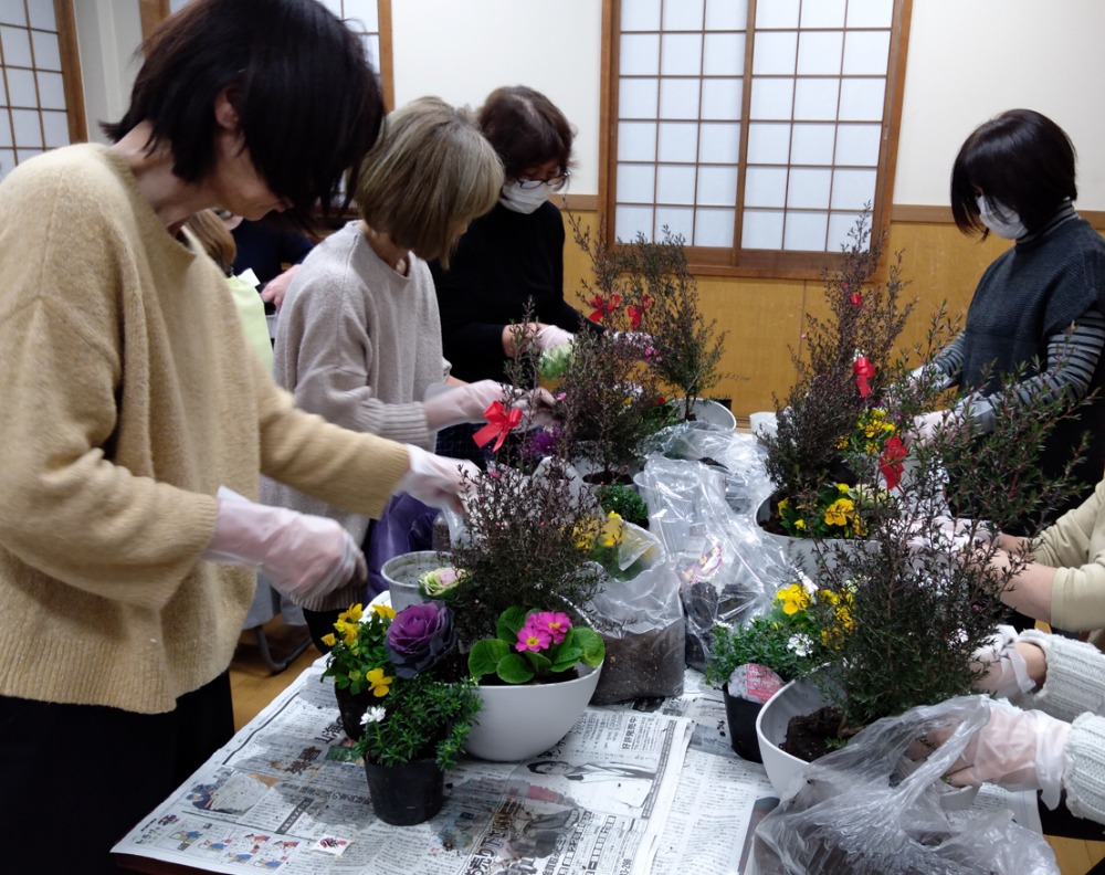 令和5年12月15日(金)クリスマスやお正月にも楽しめる、緑と花のセミナー「寄せ植え教室」を開催しました。使用したお花は、ギョリュウバイ、ビオラ、ハボタン、プリムラジュリアン、イベリスの5種類。それぞれの特性を学び各自で配置し植えました。長持ちさせる方法も教えていただきました。また、数年ぶりに、花苗の即売会も実施し、好評で多くの来館者がありました。
