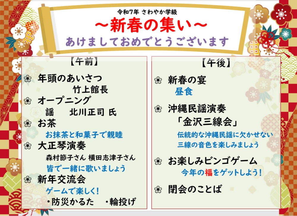 活動紹介 > 2025年1月15日 さわやか学級 第6回「新春の集い」 令和7年1月15日(水)さわやか学級「交流会:新春の集い」を開催しました。三線の演奏による沖縄民謡をはじめ、防災かるたや輪投げなど学級生皆和やかに心温まるひとときを過ごしました。